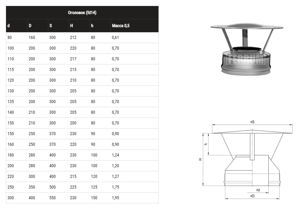 Оголовок Ferrum из оцинкованной стали является завершающим элементом дымового канала. Устанавливается на двустенный дымоход и закрывает слой теплоизоляции, защищая ее от атмосферных осадков. Также предотвращает попадание атмосферных осадков в канал дымохода.