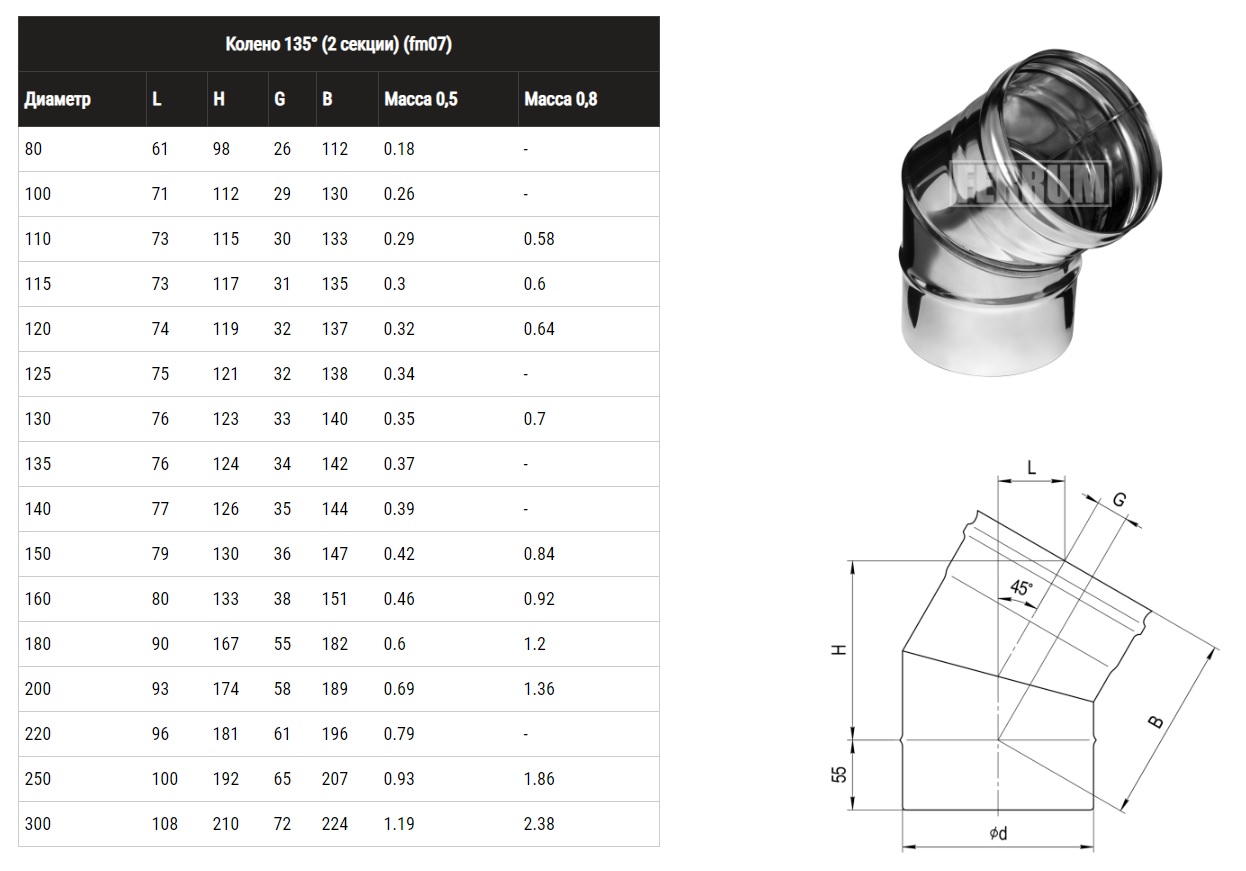 Колено угол Ferrum 135° из нержавеющей стали (2 секции) толщиной металла 0,8 мм элемент дымовой системы, с помощью которого можно изменить направление канала на угол 135° с целью обхода препятствий.