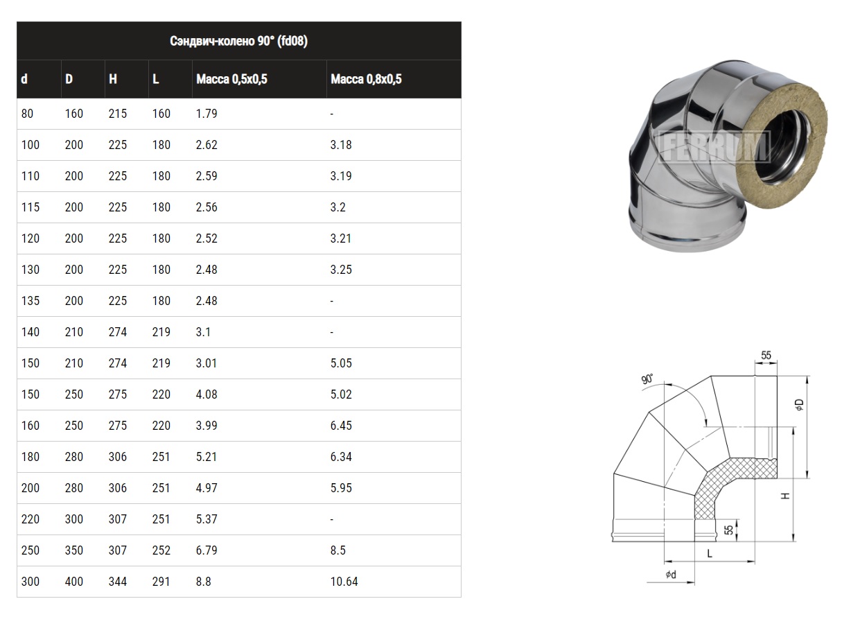 Сэндвич-колено Ferrum 90° из нержавеющей стали - элемент дымовой системы, с помощью которого можно изменить направление канала (на угол 90°) с целью обхода препятствий.