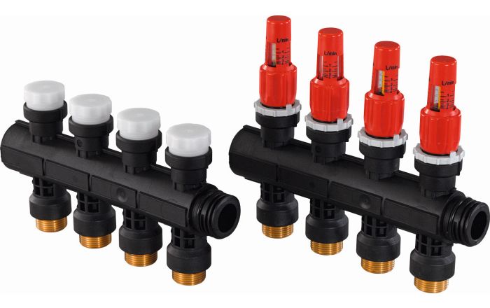 Предназначены для водяных систем поверхностного отопления/охлаждения, низкотемпературного радиаторного отопления. В комплект входят подающий и обратный коллекторы из армированного стекловолокном полиамида. Максимальная температура: 60°C. Максимальное рабочее давление 6 бар.