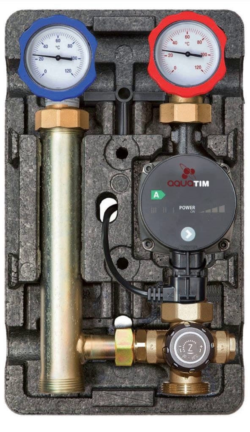 Насосная группа быстрого монтажа NG-TK -0101 представляет собой готовый комплект арматуры в сборе (без насоса), предназначенный для принудительной циркуляции, регулировки и поддержания заданной температуры теплоносителя в системах отопления со смесительным контуром. Чаще всего используется в качестве контура теплого водяного пола. Эффективность такой системы обеспечивается принципом многократной циркуляции теплоносителя во вторичном контуре с частичным отбором теплоносителя от высокотемпературного источника тепла первичного контура и подмесом теплоносителя из обратной линии. В качестве теплоносителя могут использоваться жидкости, неагрессивные к материалам изделия: вода, растворы на основе гликоля. Максимальное содержание гликоля до 40%.