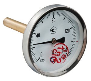 Погружной биметаллический термометр для измерения температуры жидкостей и газов. При оснащении гильзой из нержавеющей стали может использоваться в системах с агрессивной средой. Корпус выполнен из стали. Диаметр корпуса – 63 мм. Класс точности – 2,5. Диапазон измерений – от 0 до 160 °С. Максимальное рабочее давление (на гильзе) – 2,5 МПа. Подключение – осевое (заднее). Резьба присоединения на гильзе – ½".