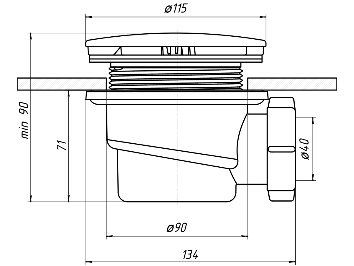Сифон для душевого поддона со сливным отверстием 90мм. Монтажная высота 77мм. Крышка сифона покрыта нержавеющей сталью толщиной 0.3мм