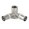 Угловой пресс-фитинг-тройник с креплением (проходная водорозетка) предназначен для присоединения к металлопластиковым (металлополимерным) трубам и трубам из сшитого полиэтилена элемента системы, имеющего наружную резьбу. Резьба фитинга – внутренняя трубная по ГОСТу 6357.